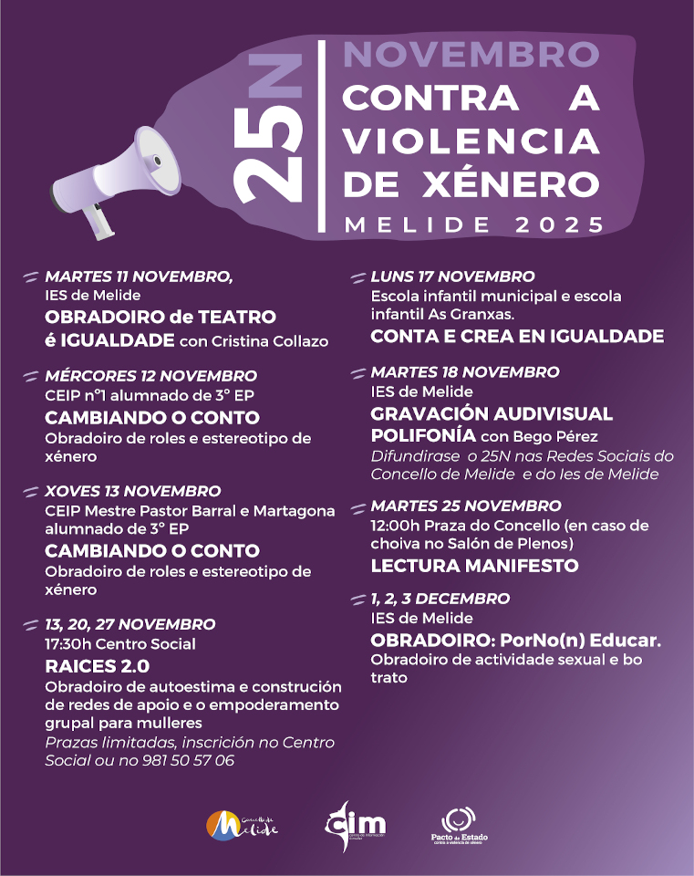 MELIDE 5 de novembro de 2025.– O Concello de Melide pon en marcha un variado e completo programa de actividades con motivo do 25 de Novembro, Día Internacional Contra a Violencia de Xénero. Un ano máis, as actividades relacionadas con esta data estenderanse durante todo o mes. O obxectivo da iniciativa é continuar a desenvolver conciencia sobre a igualdade entre mulleres e homes e cuestionar os roles de xénero e o machismo. A mocidade volve ser, un ano máis, un dos grupos de idade prioritarios nesta campaña.